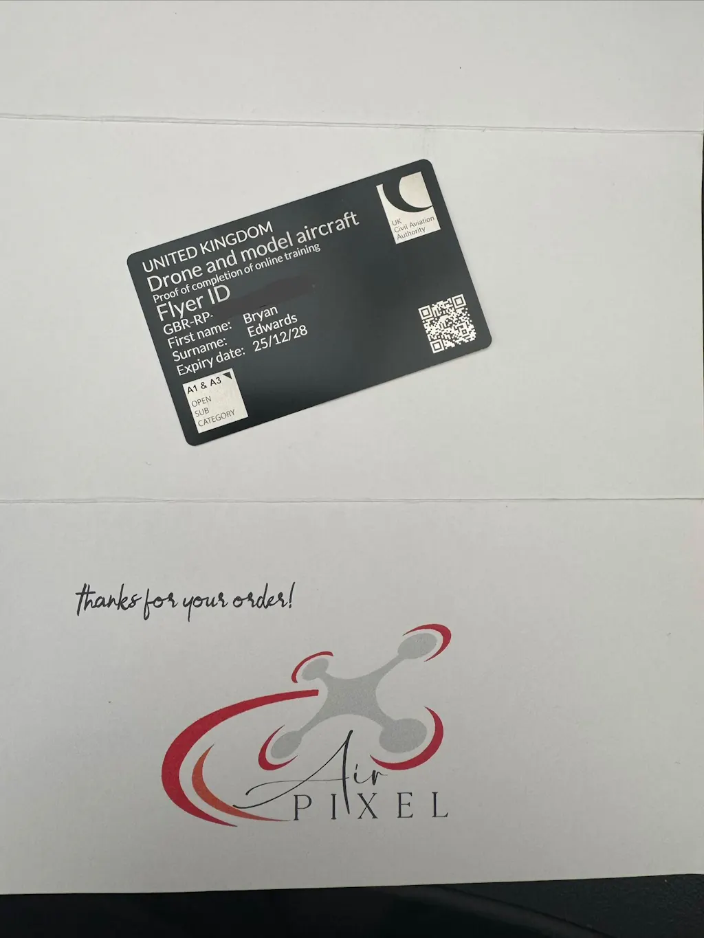 Really impressed with my metal credit card-style CAA card. The black metal finish looks sleek and professional, and the engraving for the Flyer and Operator ID is sharp and easy to read. It feels solid and high quality compared to a standard plastic card, and the credit-card size fits perfectly in a wallet. A great little upgrade for carrying my CAA details when flying — durable, stylish, and built to last.